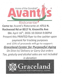 Graceland Center is partnering with Avanti's in Peoria to raise funds for our programming ! Dine in, carry out and delivery are all eligible for proceeds! Present this PRINTED flyer to the cashier upon payment and 15% of sales will go towards Graceland Center!