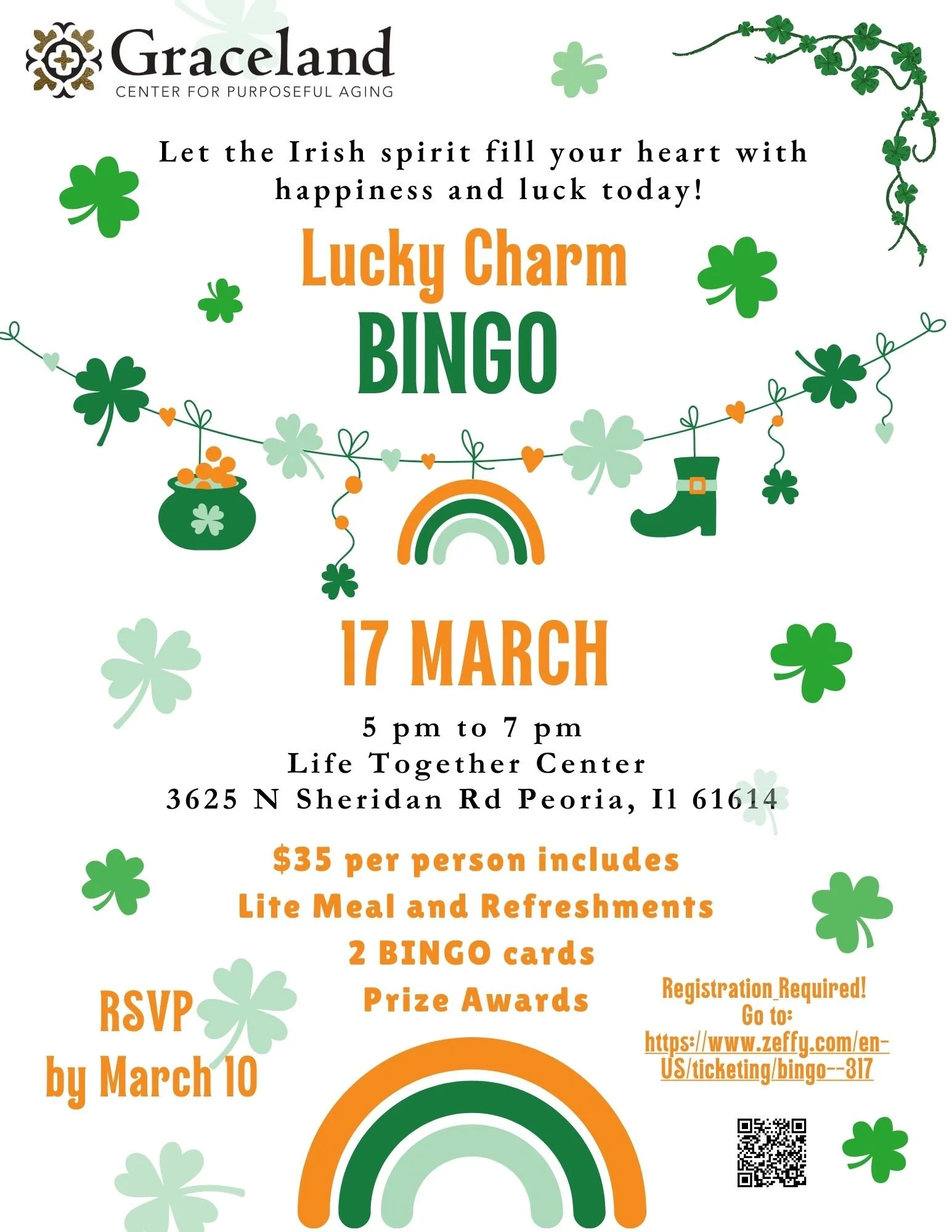 Come have some old fashioned Irish fun with us on Tuesday March 17th! We will have a baked potato bar and refreshments served at 5 pm. BINGO starts right at 5:30 pm, so get there on time! We will be playing for nice prizes donated by local vendors! All proceeds go to supporting Graceland Center programming! Reservations due by end of day Tuesday March 10th!